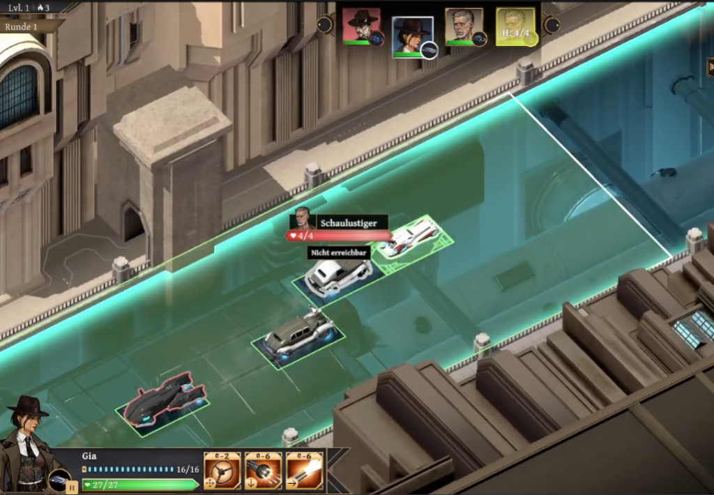 Auch hier gibt es eine ungefähre vorgegebene Rollenverteilung. Zum Beispiel ist das Auto von Gia Randazzo ein „Angriffsauto“. Sie kann auf beiden Seiten und im hinteren Bereich Waffen ausstatten, um Gegnern aus verschiedenen Richtungen Schaden zuzufügen. Im späteren Verlauf schalten wir weitere Charaktere (Crewmitglieder) frei, die uns in Kämpfen oder Dialogen helfen. Der zweite Charakter ist zum Beispiel ein Supportauto mit Heilungsfähigkeiten.